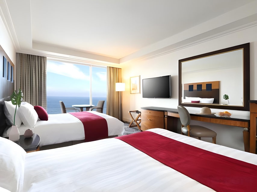 Hotel Overview: The Ramada Plaza Jeju is renowned for its luxurious design and commitment to sustainability, positioned ideally as a haven for both business and leisure travelers. The hotel's architecture draws inspiration from Jeju's natural beauty, featuring eco-friendly practices and modern aesthetics that highlight its unique location near the vibrant Tapdong Beach Plaza. Accommodations: Ramada Plaza Jeju caters to a variety of travelers with its richly appointed rooms and suites. Guests can enjoy a comfortable stay in one of the 400 elegantly appointed guestrooms. Each room at Ramada Plaza Jeju offers unparalleled luxury and comfort. Guests can choose from a variety of room types including standard rooms, deluxe suites, and exclusive executive suites. All rooms feature premium bedding, marble bathrooms with designer toiletries, private balconies offering views of the city or ocean. Modern amenities include high-speed Wi-Fi, flat-screen TVs, and well-stocked minibars. Amenities: Guests at Ramada Plaza Jeju enjoy top-tier amenities such as concierge services, valet parking, private cabana rentals by the poolside, advanced business centers with conference facilities. Exclusive services like butler service and limousine rentals are also available to enhance the luxury experience. Dining Options: Ramada Plaza boasts three exquisite restaurants each presenting distinct culinary experiences ranging from local Korean delicacies to international cuisine. Highlights include a rooftop restaurant offering panoramic views of the ocean with seafood specialties prepared by Michelin-starred chefs. The hotel also provides extensive room service options including breakfast in bed featuring gourmet selections. Nearby Location & Transportation: The hotel is conveniently located just 5 kilometers from Jeju International Airport and closely connected to major train stations and road networks ensuring easy access to various parts of the city. Nearby Attractions: Jeju Folklore & Natural Museum - 2 km: Explore regional history and ecology. Tapdong Beach Theater - 1 km: Enjoy vibrant local performances. Wellness And Activities: The wellness center at Ramada Plaza features an expansive spa offering signature treatments like aromatherapy massages and seaweed wraps along with modern hydrotherapy facilities. A state-of-the-art fitness center is complemented by daily yoga classes in a tranquil environment. Additionally guests can relax at our indoor pool area designed for serene retreats. Policies & Check-In Instructions: Check-in time starts at 3 PM; Early check-in subject to availability. Valid government-issued identification required upon check-in. Pet-friendly policies apply; please contact front desk for more details on accommodations for pets. Summary: Situated in the heart of Jeju City near key attractions Ramada Plaza represents an ideal choice for those seeking luxury convenience tailored both for families and business travelers alike Disclaimer notification: Amenities are subject to availability and may be chargeable as per the hotel policy.