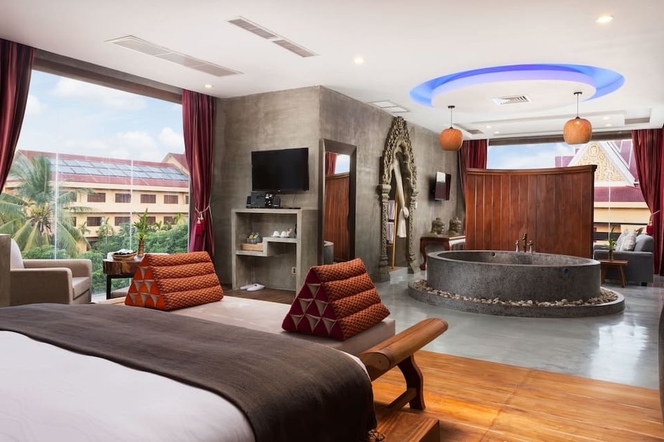 Situato nel centro di Siem Reap, Cambana d'Angkor Suites dista meno di un quarto d'ora a piedi da Giardini Reali e da Residenza reale di Siem Reap. Questo hotel per golfisti dista 1,8 km da T Galleria by DFS e 1,9 km da Museo nazionale di Angkor. Lasciati coccolare presso la spa, dove ti attendono massaggi, trattamenti per il corpo e trattamenti per il viso. Questo hotel in stile Art Déco propone il Wi-Fi gratuito, servizi di concierge e un servizio babysitter a pagamento. Gli ospiti potranno raggiungere i vicini negozi grazie alla navetta gratuita. Un hotel dispone di un ristorante e di un'ampia scelta di snack al bar/caffetteria. Potrai anche scegliere di restare nella tua stanza e richiedere il servizio in camera con orario limitato. Incontra gli altri ospiti al cocktail di benvenuto offerto tutti i giorni. Rilassati con il tuo drink preferito presso un bar/lounge e un bar a bordo piscina. La colazione continentale è disponibile a pagamento tutti i giorni dalle ore 07:00 alle ore 10:00. Potrai usufruire di accesso gratuito a Internet via cavo, un business center aperto 24 ore su 24 e check-in veloce. Potrai usufruire di una navetta da e per l'aeroporto con orario limitato a pagamento; inoltre, in loco troverai il un parcheggio gratuito. Rilassati in una delle 9 camere con stile personalizzato della struttura, complete di frigorifero e TV LCD. Le camere sono dotate di balcone. Il computer con connessione Internet inclusa, wireless e via cavo, ti consente di restare in contatto con il mondo, mentre la TV con canali via satellite è l'ideale per concedersi un po' di svago. Il bagno in camera dispone di vasca e doccia separate, set di cortesia gratuiti e asciugacapelli.